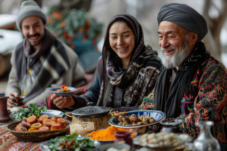An intimate scene of friends sharing laughter and traditional foods during a Nowruz celebration, depicting joy and cultural heritage.