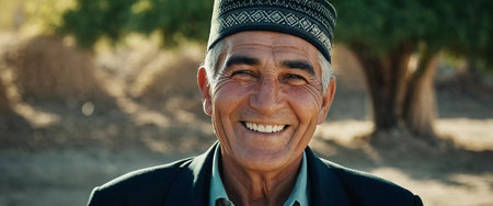 A joyful Tajik man 75 years old wearing traditional clothing stands outdoors with a broad smile against a natural backdrop on a sunny day. A resident of Tajikistan smiles. Generated by AI