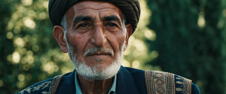 An elderly man from Afghanistan showcases his weathered face, reflecting years of wisdom and resilience against a modest backdrop of nature, embodying the rich culture of his homeland. Generative AI.