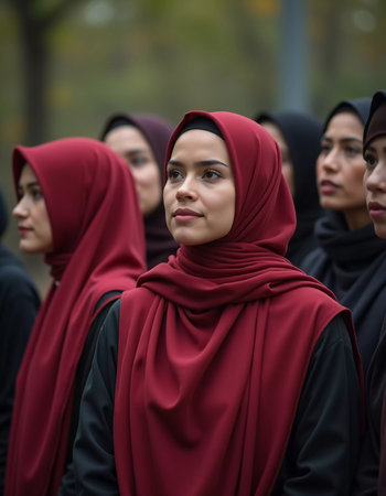 A diverse group of Muslim women in colorful hijabs stands confidently together. They share smiles and camaraderie enjoying a moment of togetherness and happiness. Beautiful young women. Generative AI.