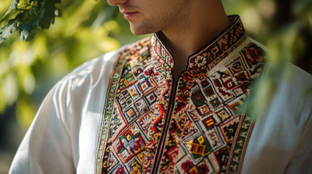 Young Man in Traditional Embroidered Shirt Surrounded by Greenery in Sunny Outdoor Setting