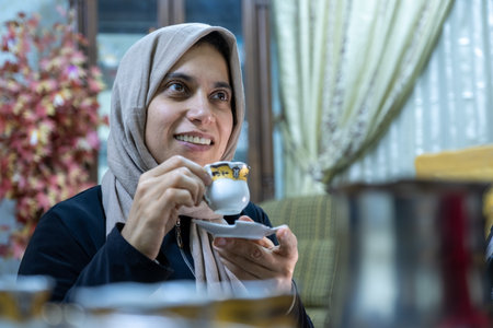 A joyful woman from Afghanistan smiles warmly, displaying a sense of resilience. Her colorful scarf reflects cultural heritage as she sits in her inviting home environment. Generative AI.
