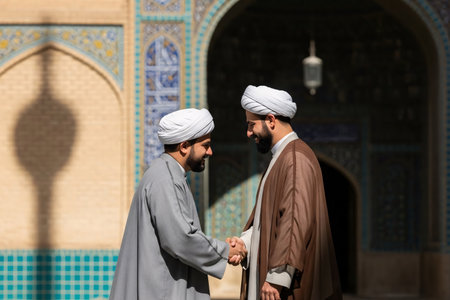 A group of men wearing traditional attire are engaged in conversation outside a mosque, likely after a prayer service. The setting is bustling, indicating a lively atmosphere.