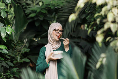 Young charming muslim woman in casual clothes and hijab holding bowl with fresh organic salad walking on green tropic summer park. Concept of healthy eating.