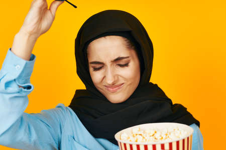 Close up of Asian muslim teenage girl wearing yellow hijab looking up and thinking, half face portrait with copy space above, against red background