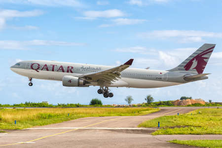 Mahe, Seychelles - February 2, 2020: Qatar Airways Airbus A330 airplane at Mahe airport (SEZ) in the Seychelles. Airbus is a European aircraft manufacturer based in Toulouse, France.