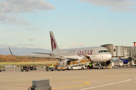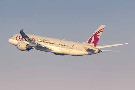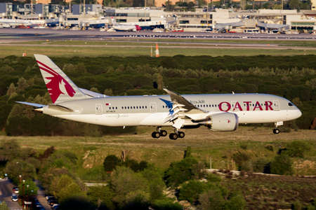 Milan, Italy - February 15, 2018: Qatar Airways Boeing 787-8 Dreamliner airplane at Milan Malpensa Airport (MXP) in Italy. Boeing is an American aircraft manufacturer headquartered in Chicago.