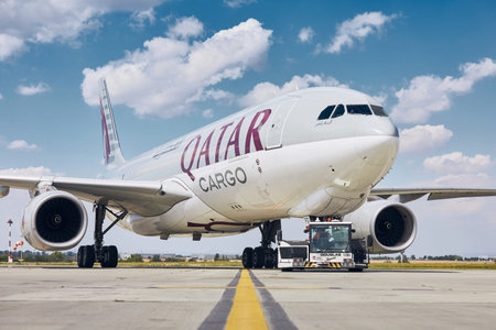 Prague, Czech Republic - July 24, 2020: Cargo airplane Airbus A330F of Qatar Airways at Vaclav Havel Airport Prague in Czech Republic on July 24, 2020.