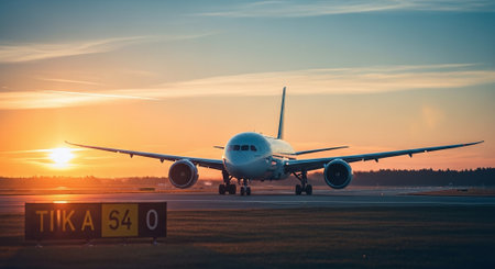 Airplane on the runway of the airport at sunset. Travel concept