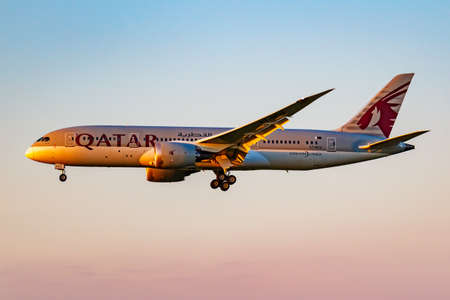 Moscow, Russia - June 20, 2019: Aircraft Boeing 787-8 Dreamliner A7-BCU of Qatar Airways landing at Domodedovo international airport in Moscow on a blue sky background at sunny evening