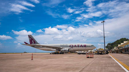MAHE, SEYCHELLES - OCTOBER 4, 2018: Qatar Airways Plane at Mahe airport in Seychelles. Qatar Airways is included in the list of seven airlines with the highest five-star rating under the version of the British agency Skytrax.