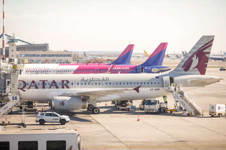 Otopeni, Romania - February 25, 2020: Wizzair and Qatar Airways airplanes on Henri Coanda International Airport, near Bucharest, Romania.