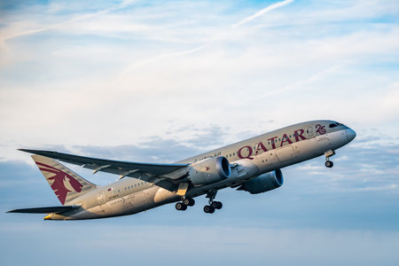 Brussels, Belgium - Dec 21, 2025: Qatar Airways Boeing 787 Dreamliner taking off from Brussels Airport runway during daylight under cloudy sky.