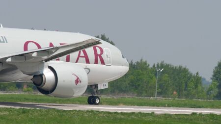 Prague, Czech Republic - August 13, 2020: Cargo airplane Boeing 777F of Qatar Airways at Vaclav Havel Airport Prague in Czech Republic on August 13, 2020.