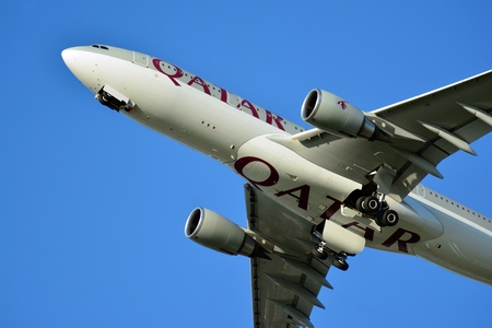 Warsaw, Poland.4 August 2018. Airplane A7-ACL Qatar Airways Airbus A330-202 taking off from the Warsaw Chopin Airport.