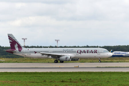 DOMODEDOVO, RUSSIA - JULY 20 Aircraft operated by Qatar Airways, readiy to take off at Moscow airport in Domodedovo on July 20, 2013 The company in its fleet has 12 aircraft Airbus-A321