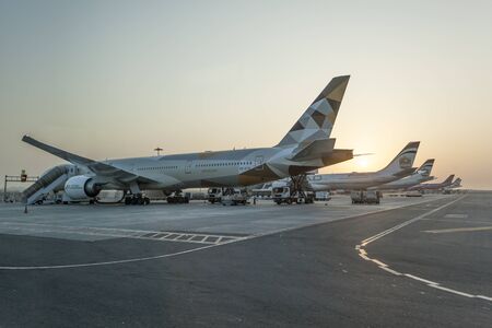 ABU DHABI, UAE - NOV 24, 2016: Etihad Airlines aircrafts at the runway of the Abu Dhabi International Airport