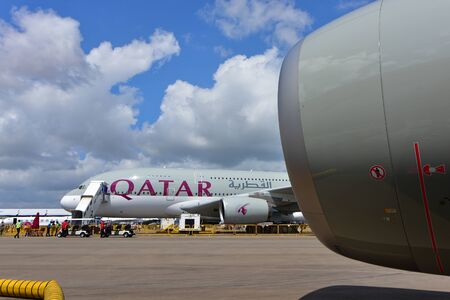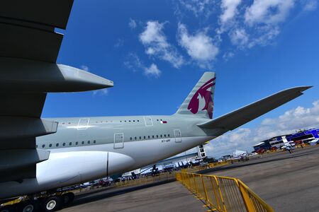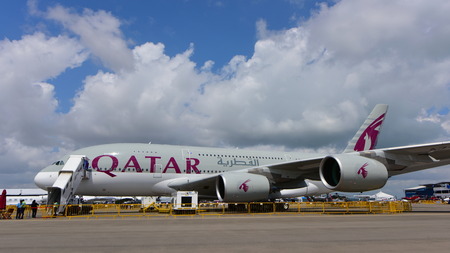SINGAPORE - FEBRUARY 16: Qatar Airways Airbus A380 super jumbo on display at Singapore Airshow February 16, 2016 in Singapore