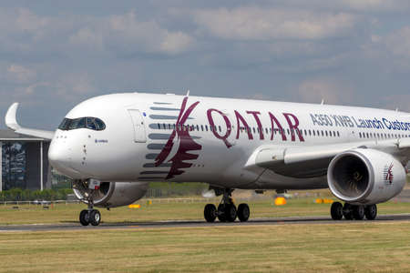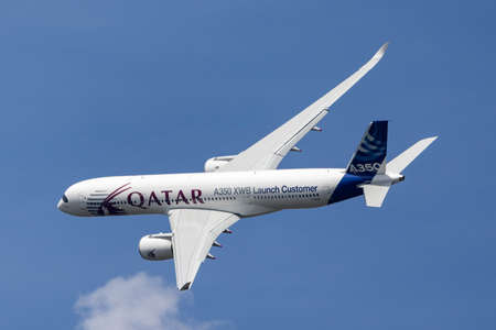 Farnborough, UK - July 18, 2014: Airbus A350-941 commercial aircraft with a hybrid Airbus/Qatar Airways livery.