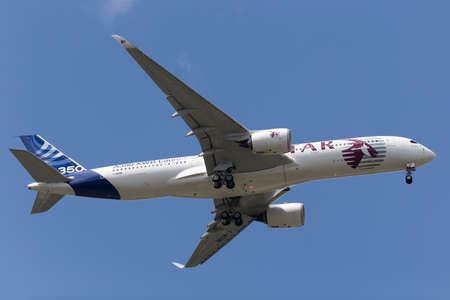 Qatar Airways Airbus A 350 aircraft on the final approach to the international airport in Zurich in Switzerland 24.4.2021