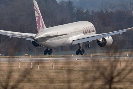 Zurich, Switzerland, February 24, 2022 Qatar Airways Boeing 787-8 Dreamliner aircraft on its final approach on runway 14