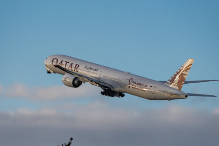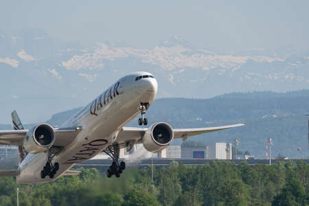 Zurich, Switzerland, May 20, 2022 Qatar Airways Boeing 777-300ER aircraft is leaving from runway 32