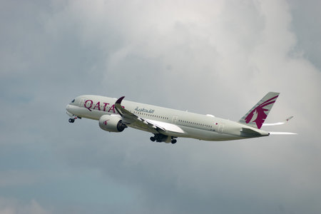 Zurich, Switzerland, May 2, 2023 A7-AME Qatar Airways Airbus A350-941 aircraft take off from runway 28