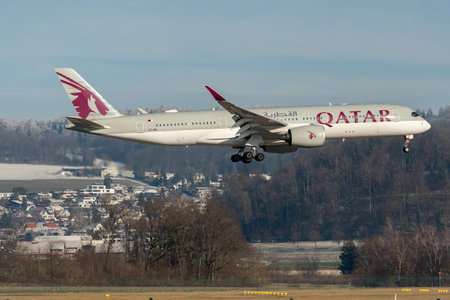 Zurich, Switzerland, January 14, 2024 A7-AML Qatar Airways Airbus A350-941 aircraft is landing on runway 14