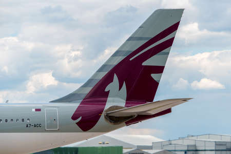 MANCHESTER, UNITED KINGDOM - AUG 07, 2015: Qatar Airways Airbus A330 tail livery at Manchester Airport Aug 07 2015.