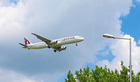 Budapest Liszt Ferenc, Hungary – June 11, 2018: A Qatar Airways Airbus A321-231 with the registration A7-ADT on approach to Budapest Liszt Ferenc Airport in Hungary.