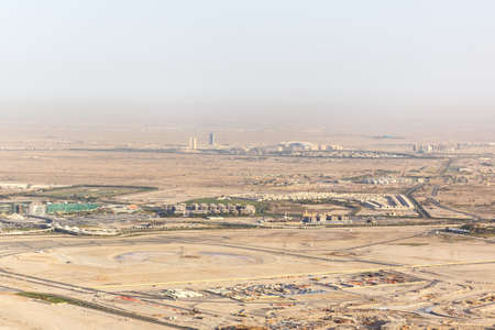 DOHA, QUATAR - DECEMBER 12, 2016: City aerial skyline from the airplane. Doha is a major hub for eastern travels.
