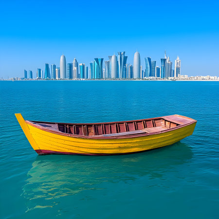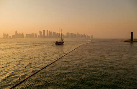 doha city skyscrapers urban skyline view and dhow boat in qatar at sunset
