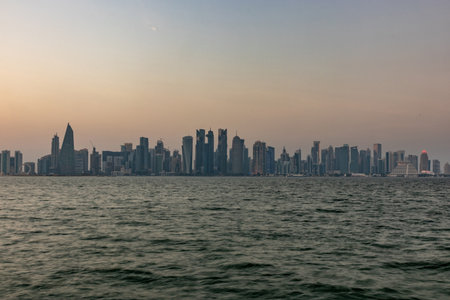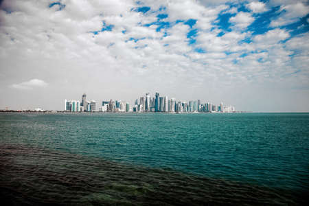 Doha skyline view with amazing sea. Panoramic view of the tall skyscrapers of Doha in Qatar. Persian Gulf countries