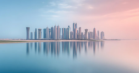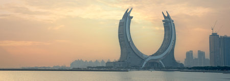 The Panoramic skyline of Doha, Qatar during sunset sunrise