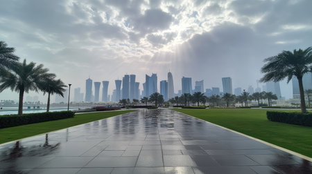 Doha's Elegance: Captivating view of Doha's modern skyline from Sheraton Park on January 14, 2022, with a cloudy sky above.