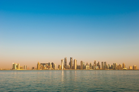 Skyline of the arabian city of Doha in Qatar, captured in the very early morning with the rich warm colours from the sun reflecting off the glass skyscrapers. This skyline changed drastically over the past 5 years and this image was captured on 29 Octobe