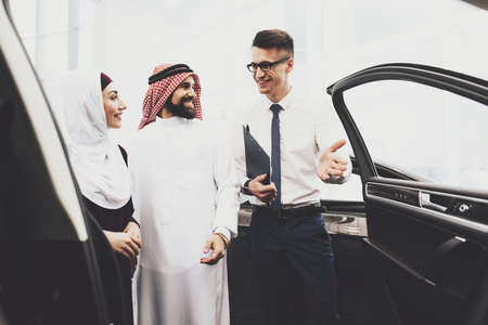 Salesman shows a car to a young couple of Arabs.