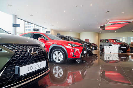 Murmansk, Russia - June 21, 2019: Cars in showroom of dealership Lexus in Murmansk city in Russia