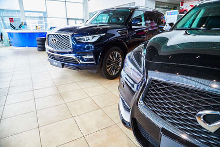 Petrozavodsk, Russia - June 19, 2019: Cars in showroom of dealership Nissan in Petrozavodsk city in Russia