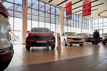 Kirov, Russia - March 07, 2019: Cars in showroom of dealership Kia in Kirov in 2019
