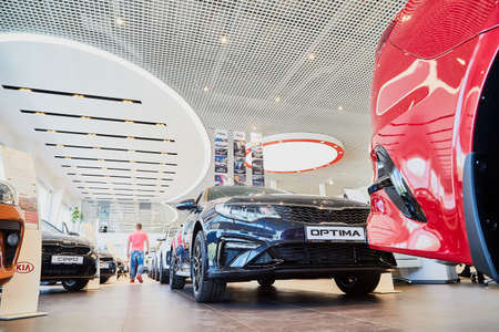 Vologda, Russia - June 18, 2019: Cars in showroom of dealership KIA in Vologda in Russia
