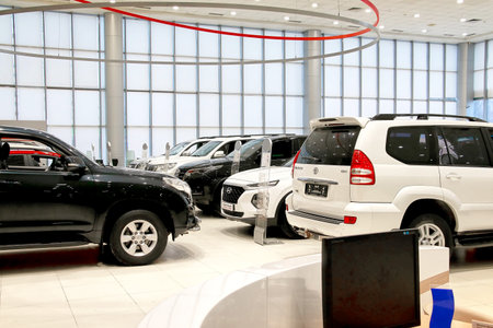 Kazan, Russia - October 16, 2018: Cars in showroom of dealership Toyota in Kazan city in Tatarstan in 2018