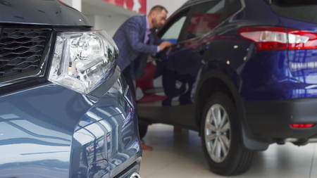 An attentive salesman inspects the condition of one of the cars