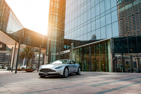 Dubai, United Arab Emirates, Junuary 20th, 2020 : Luxury sports cars at downtown Dubai next to Burj Khalifa, United Arab Emirates