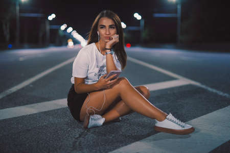 Portrait woman in earbuds sitting on night road listening to music in earphones enjoying playlist songs on mobile