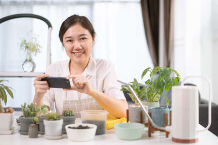 Happy Asian woman planting a houseplants and taking a photograph of a small houseplants and cactus by using smartphone. Asian girl enjoy a take a photo of small decoration plant.