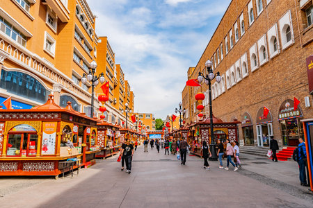 Urumqi International Grand Bazaar Shopping Street with Walking People on a Sunny Blue Sky Day