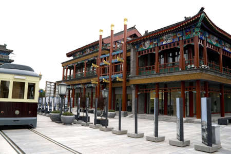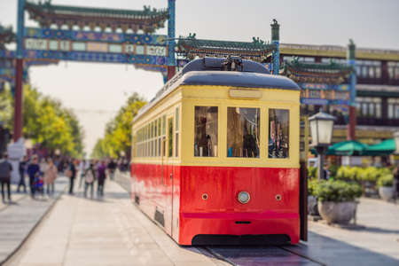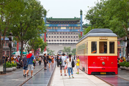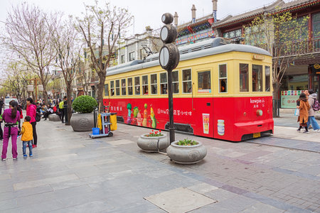 Editorial: BEIJING, CHINA, April 6, 2019 - Tram passing by in Qianmen St. near a Hutong in Beijing