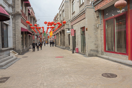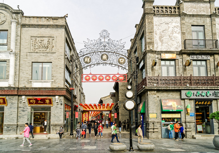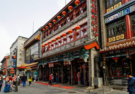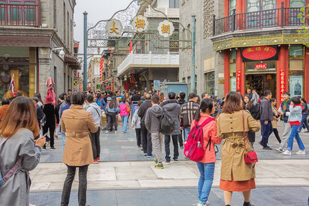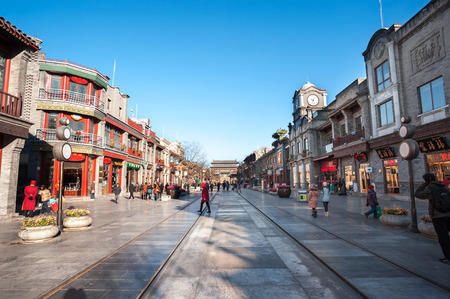 BEIJING, CHINA - APR 6, 2016: Qianmen street, famous commercial street in Beijing, China. It is 840 m long and 21 m and has the age of over 570 years.