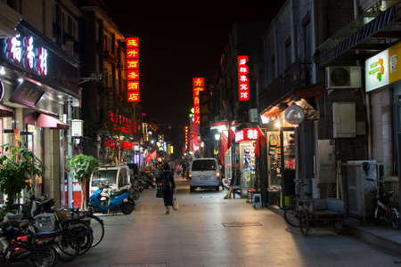 BEIJING, CHINA - SEPTEMBER 29: Hutong street night view with people walking. Beijing city center area